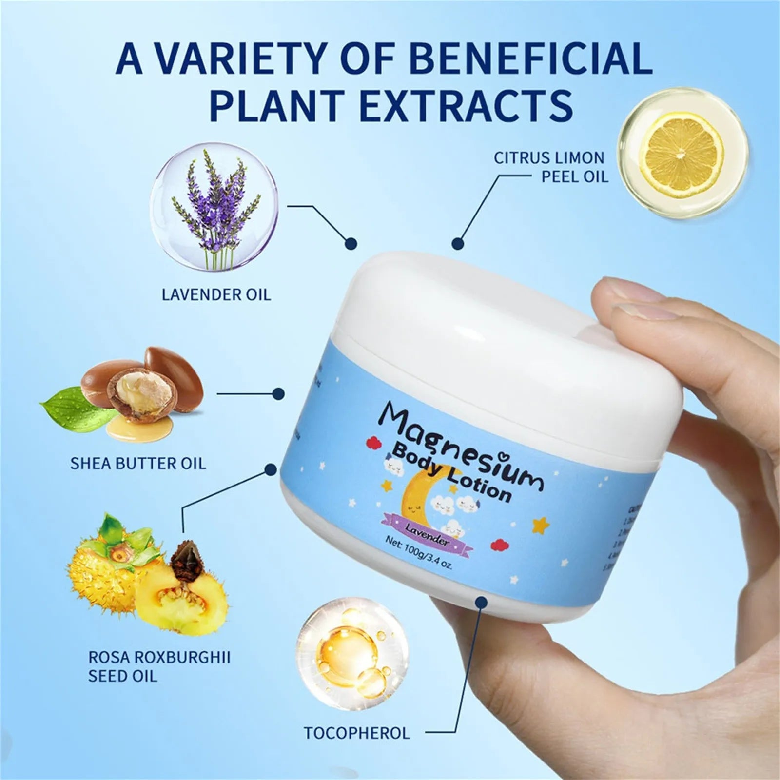 The soothing benefits of natural lavender oil are infused into our lotion to help promote relaxation and calmness in children before bedtime. Lavender is well-known for its calming properties, and when combined with magnesium, it enhances the lotion's effectiveness in creating a peaceful pre-sleep environment. This delightful aroma not only pleases the senses but also helps establish a tranquil bedtime routine, encouraging your child to wind down after a busy day.