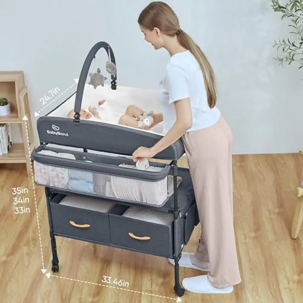 This changing table is thoughtfully designed with upgraded height adjustment capabilities, featuring three different heights ranging from 33 inches to 35 inches. This ensures that the table accommodates caregivers between 4.8 and 6 feet tall, effectively eliminating the need to bend or kneel during diaper changes. Coupled with four removable universal wheels equipped with safety locks, this table can be effortlessly moved from room to room, making it easy to transition from one space to another without disrupting your routine.