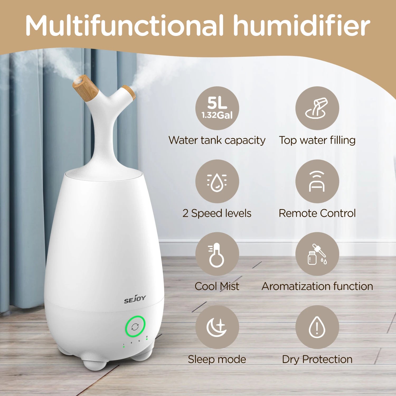 The Sejoy Ultrasonic Cool Mist Humidifier is designed with a generous 5-liter (1.32-gallon) tank that allows it to run continuously for up to 24 hours without the need for refilling. Its powerful cool mist output can reach a maximum of 350 mL/h, making it suitable for large rooms and ensuring your living space remains comfortably humidified. This humidifier is equipped with a dry protection feature, automatically shutting off when the tank is empty, providing peace of mind while you sleep or go about your day. The elegant design and durable materials seamlessly blend into your home decor, making it a functional yet stylish addition to your space.
