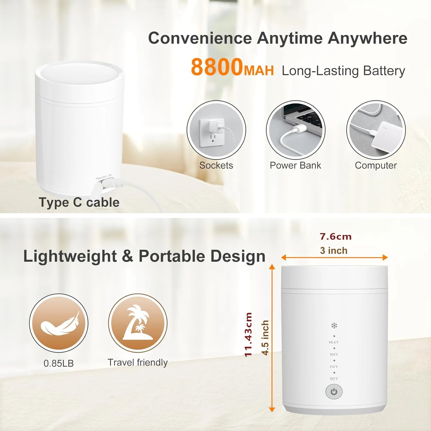 Designed with night feedings in mind, this baby bottle warmer features an auto shut-off function that activates with beeps when the milk is ready, ensuring you can comfortably feed your baby without worrying about overheating. With a 12-hour insulation feature, it keeps milk warm, so it's always ready when your little one needs it. Operating quietly throughout the warming process, the Wireless Milk Bottle Warmer allows you to make feeding easier and more discreet, ensuring that your baby's sleep is undisturbed.